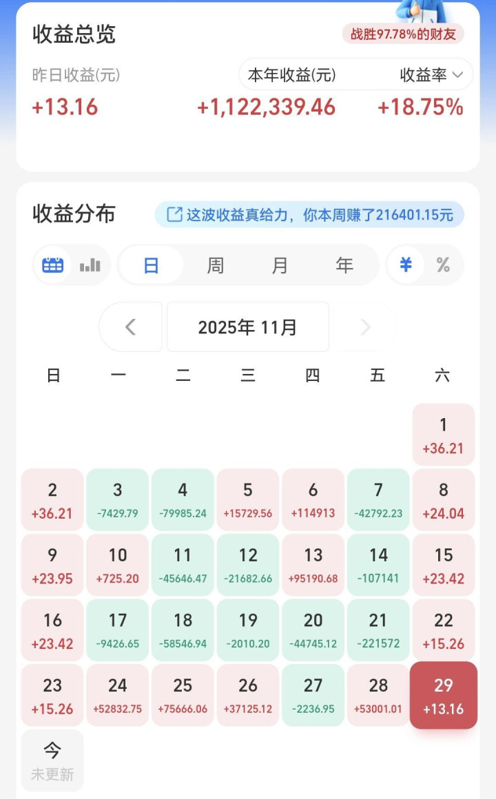 1、目前,今年来大头赚了112万,11月现在大亏了,12月应该会大赚。跟着的朋友整体还是吃肉的。还有,慢牛2.0来了的话,届时就是全面牛市了,到时吃肉吃到手软啊!